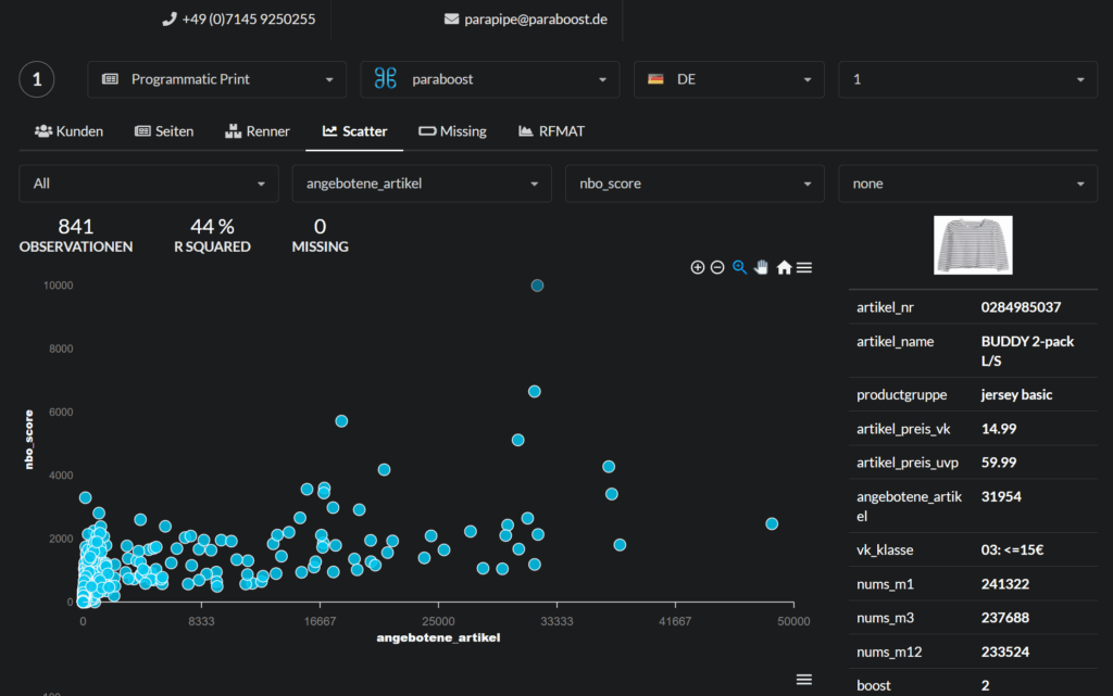 Zusätzlich stellen wir Ihnen eine Übersicht der individuellen Produktempfehlungen pro Kunde zur Verfügung. So sehen Sie jederzeit, welche Inhalte, Sortimente oder Angebote ausgespielt wurden – für maximale Transparenz und Rückkopplung in Ihre Systeme.
