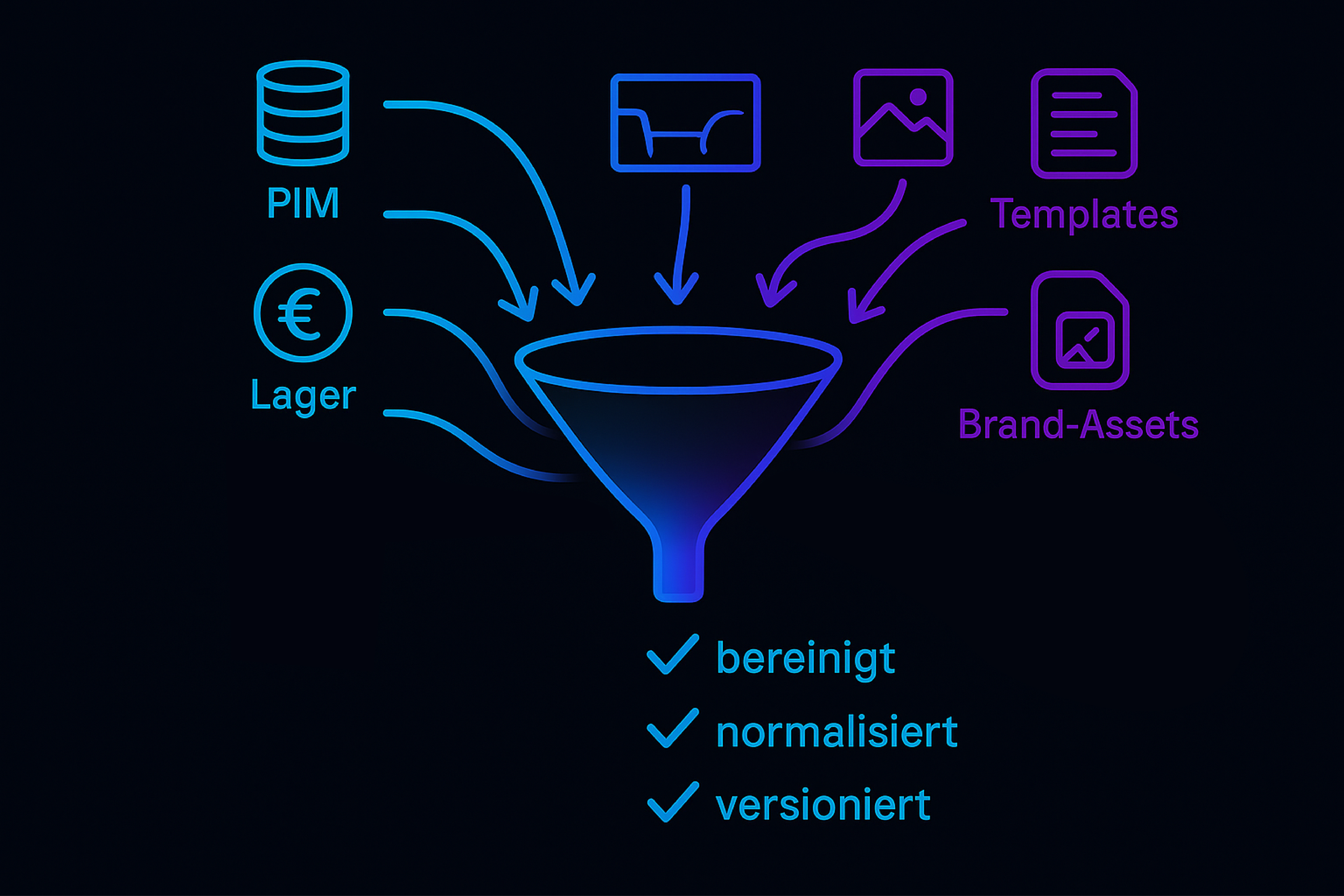 PIM, Preise, Lager, CRM-Signale, Brand-Assets und Templates werden bereinigt, normalisiert und versioniert.